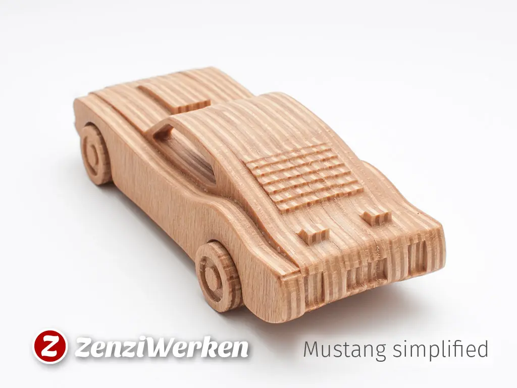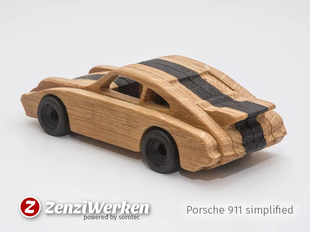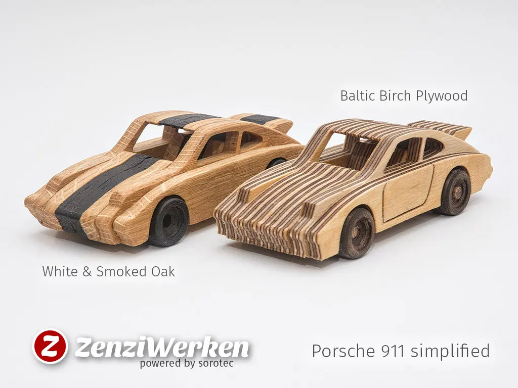 Nach einer ganzen Menge hübscher Flugzeugmodelle habe ich begonnen Automodelle zu entwerfen. Als Achsen verwende ich 5/6 mm Buchenrundstäbe. Für die Hinterachsen sind zwei passende Beilagscheiben eingesetzt, damit die Reifen etwas weiter nach außen stehen.